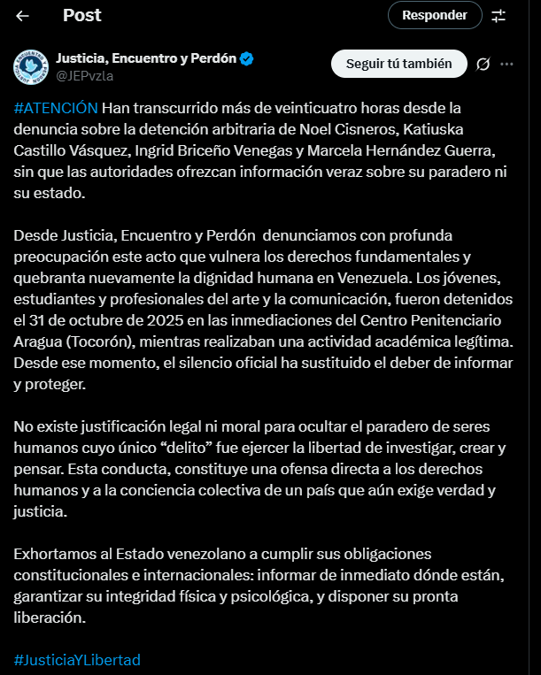 La organización no gubernamental Justicia, Encuentro y Perdón (JEP) denunció la noche de este sábado 1 de noviembre la desaparición forzada de cuatro estudiantes de la Universidad Central de Venezuela (UCV), quienes fueron detenidos el pasado 31 de octubre en las inmediaciones del Centro Penitenciario de Aragua (Tocorón), sin que hasta el momento las autoridades hayan ofrecido información sobre su paradero ni su estado físico.