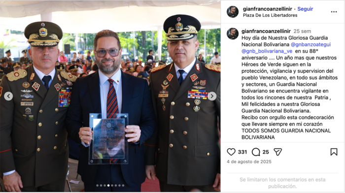 “Siempre recibo condecoraciones públicas y de empresas privadas porque tengo la Fundación RG y apoyo a mucha gente en el tema de salud”, justificó ante Armando.info los actos de reconocimiento con los que frecuentemente la Guardia Nacional Bolivariana lo distingue.