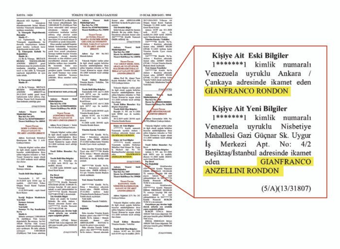 Mientras, en la cuenta de redes sociales de su empresa más conocida por el público, Centro de Especialidades Médicas Colina C.A., se le menciona como presidente fundador con dos apellidos. Asimismo, el boletín de la Cámara de Comercio de Turquía, de enero de 2020, certifica el cambio de dirección del presidente de la empresa TAC Group Sderl, Gianfranco Anzellini Rondón, de Ankara a Estambul.