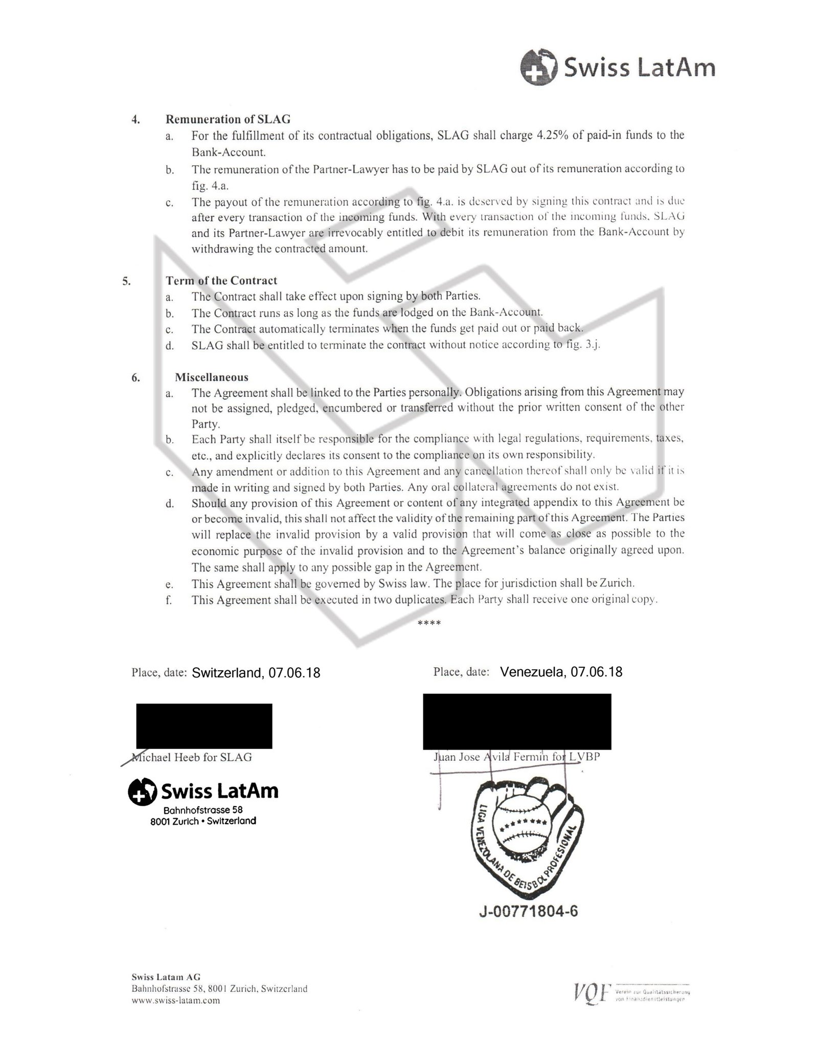 Otro documento que ofrece indicios sobre el mecanismo y que se encuentra en la investigación fiscal es el acuerdo de procedimiento de pago entre Swiss Latam AG (SLAG) y la LVBP. El objetivo central del convenio era ceder a la empresa suiza la gestión del flujo de pagos de aproximadamente 3,6 millones de euros en fondos de patrocinio provenientes de Pdvsa. Allí se indica que Swiss Latam asignaría un abogado asociado y que sería este, en lugar de la propia Liga, el único autorizado para ejecutar transferencias. Se refería, claro, a Tsvetan Tsanev. Por todo ello, Swiss Latam iba a cobrar comisiones equivalentes a 4.25% de las transferencias.