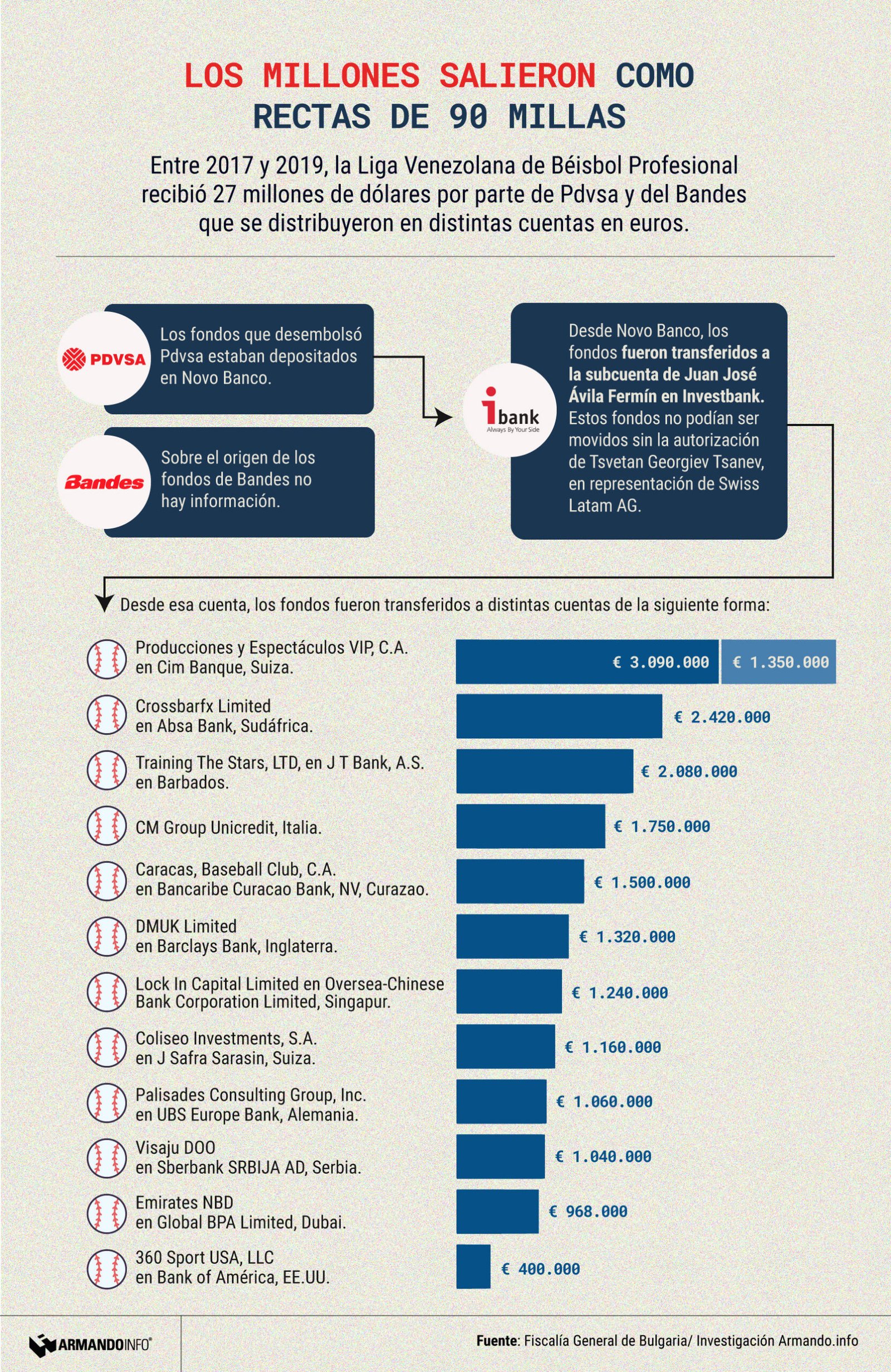 La transferencia más gruesa fue de 3,09 millones de euros a una cuenta de Producciones y Espectáculos VIP, C.A. en el Cim Banque de Suiza. La empresa, que debía encargarse de la publicidad de la Serie del Caribe de 2019 en la capital del estado Lara, también recibió 1,35 millones de euros en otra transferencia al mismo banco helvético, según lo que se desprende de los documentos de la Fiscalía de Bulgaria.