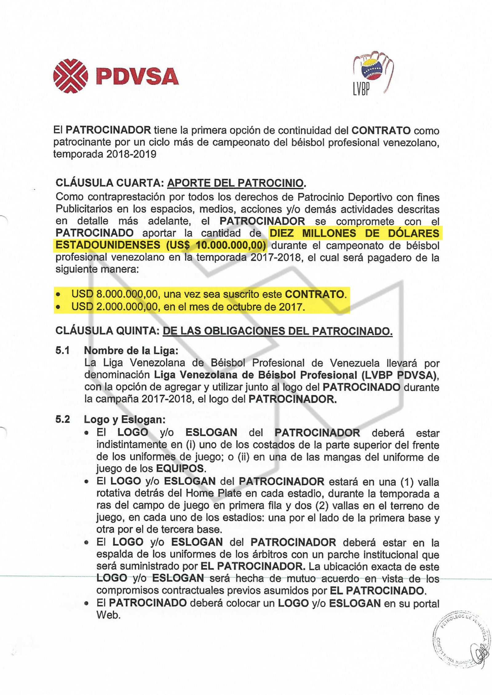 Además de los 10 millones pactados por el contrato de agosto de 2017, seguirían unos 4,8 millones de dólares por un contrato de patrocinio de la temporada 2018-2019, entre la LVBP y Bandes, este último representado por su entonces apoderada, la abogada Nadezca Tamara Mejía Maldonado.