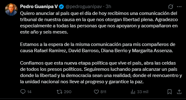 A través de su cuenta oficial en X (antes Twitter), Guanipa expresó: “Quiero anunciar al país que el día de hoy recibimos una comunicación del tribunal de nuestra causa en la que nos otorgan libertad plena. Agradezco especialmente a todas las personas que nos apoyaron y acompañaron en este año y seis meses”.