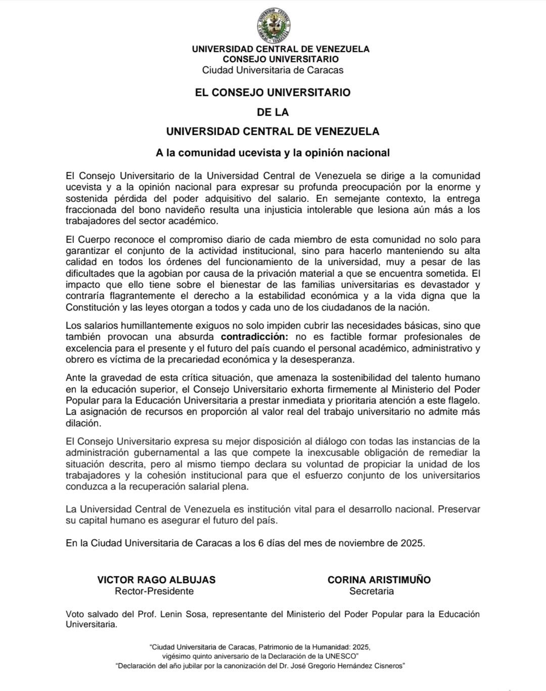 Este es el comunicado del Consejo Universitario de la UCV